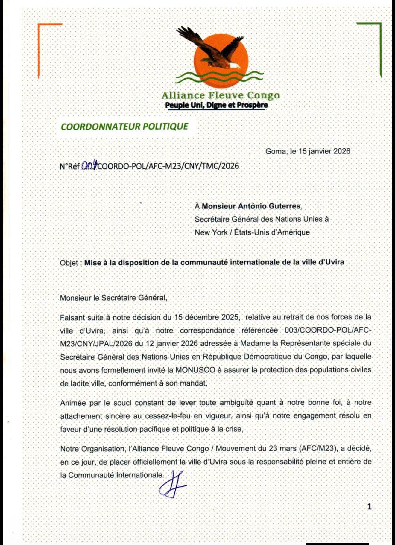 Ihuriro Alliance Fleuve Congo (AFC) rifate umutwe wa gisirikare wa M23 ryandikiye Umunyamabanga Mukuru w’Umuryango w’Abibumbye (ONU), António Guterres, rimumenyesha ko ryavuye burundu mu mujyi wa Uvira uherereye mu Ntara ya Kivu y’Epfo, kandi ko ritazongera kubazwa ibijyanye n’umutekano w’uyu mujyi.