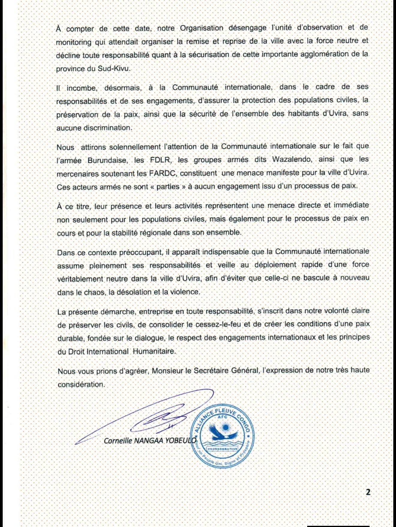 Iyi baruwa yasinywe na Corneille Nangaa Yobeluwo, umuyobozi wa politiki wa Alliance Fleuve Congo.
