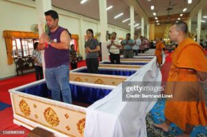 Mu rusengero rwa Wat Prommanee, ruherereye mu majyaruguru ya Bangkok, hari “ibikorwa” bibiri buri cyumweru aho abantu barenga 60 bashyirwa mu masanduku bagasengerwa. Hari amafoto menshi agaragaza abantu baryamye, batuje nk’abasinziriye, abandi bita ku masengesho barira.