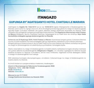 Urwego rw’igihugu rushinzwe iterambere RDB, rwatangaje ko rufunze hotel Chateau Le Marara